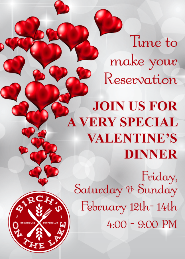 We will be celebrating Love all Valentine’s Weekend at Birch’s on the Lake with a very special Valentine’s Menu being served Friday, Saturday and Sunday, February 12th, 13th and 14th. Reserve your table today!