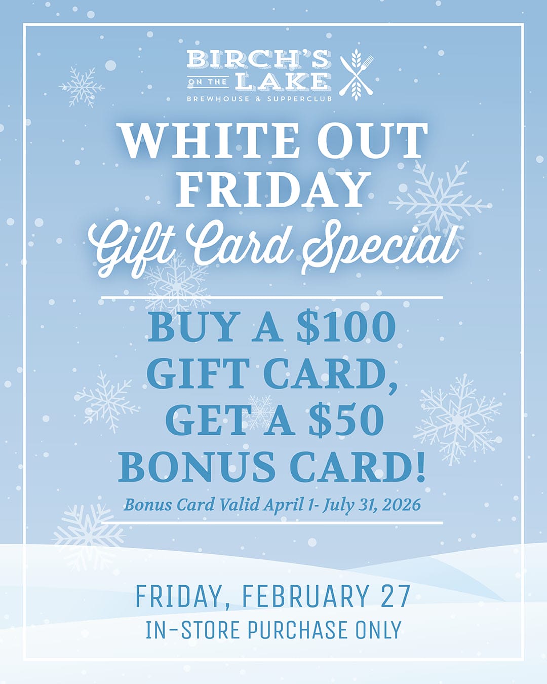 Buy $100 – Get $50 Birch’s Bonus is BACK for White Out Friday, February 27th!